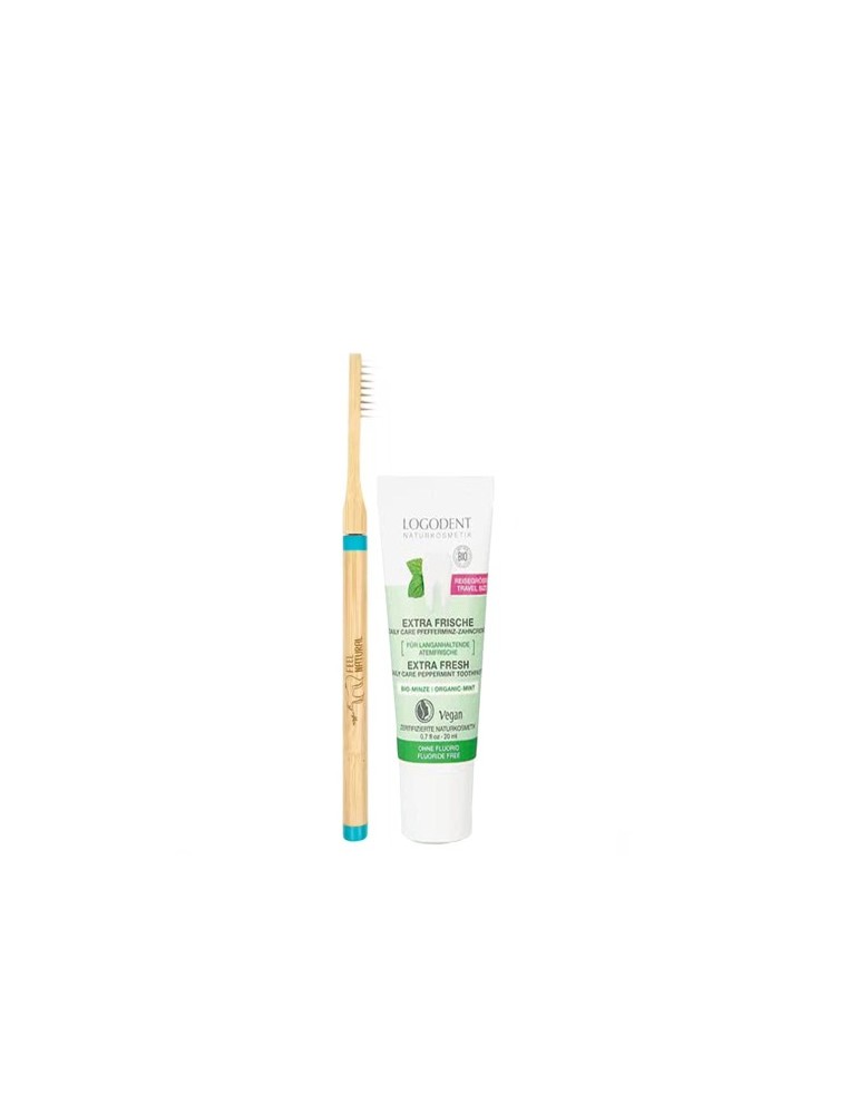 Brosse à dents en bambou avec un dentifrice végan au doux parfum de menthe, pour une haleine fraiche et un sourire éclatant